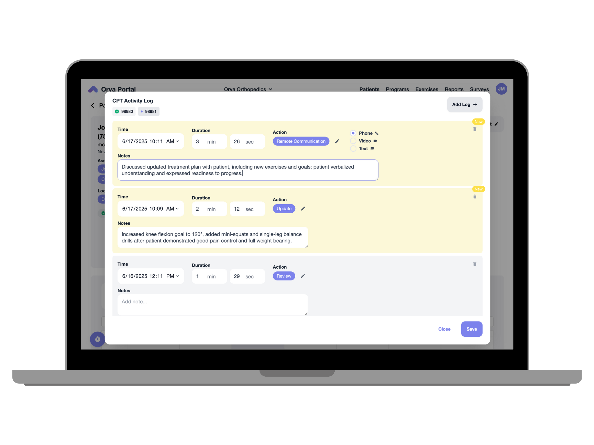The anchor of Orva. RTM happens in the background so providers do not have to track time or manually log interactions. Every exercise completed, every check-in, and every program adjustment is captured and tied back to the plan of care. The result is a complete, defensible record that meets payer requirements and unlocks reimbursement with no added burden.