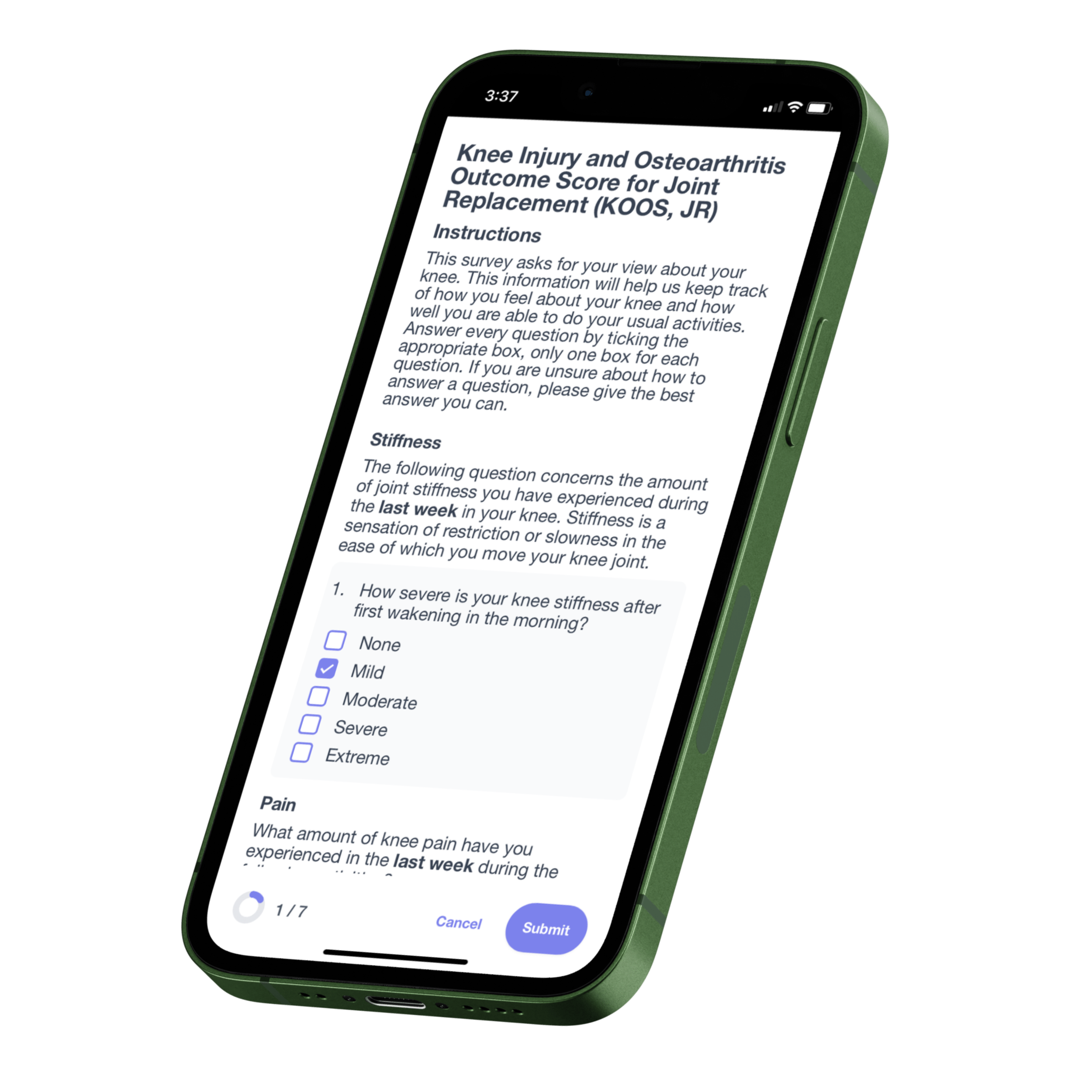 View patient responses immediately with visual dashboards that highlight improvements, plateaus, or concerning changes in patient-reported symptoms and function over time.